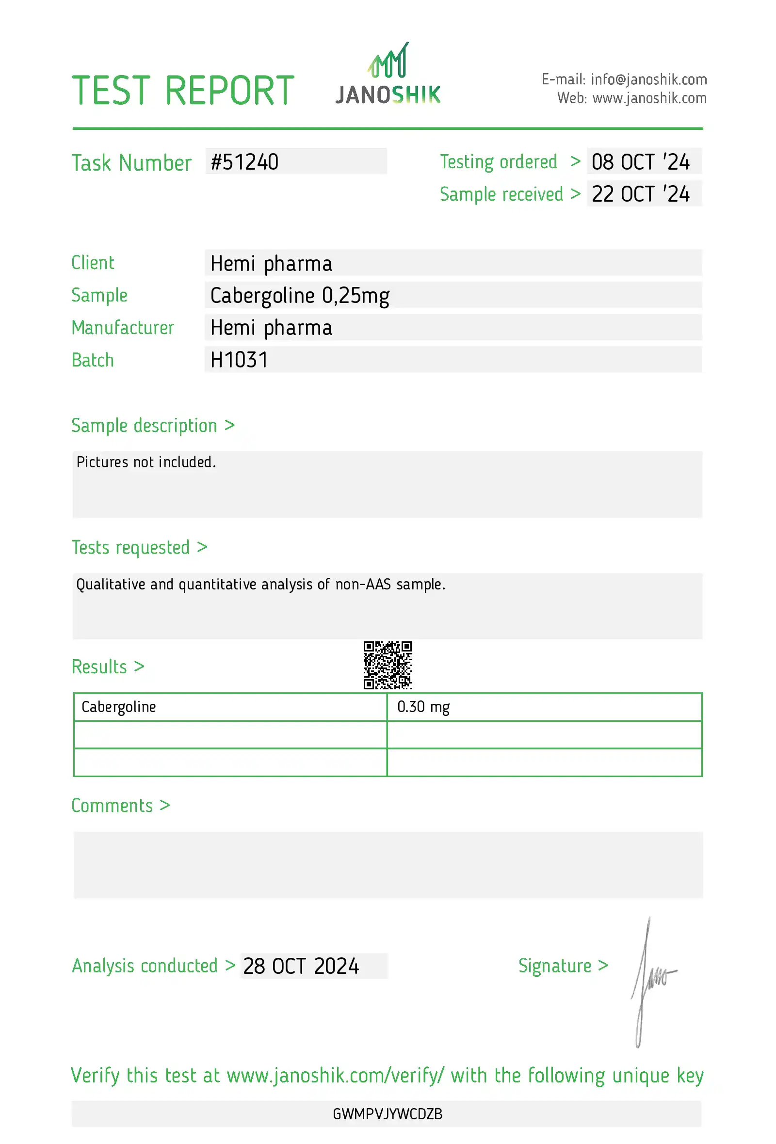 • Affordable Options: Hemi Pharma provides affordable pricing, allowing you to purchase Cabergoline without exceeding your budget.
